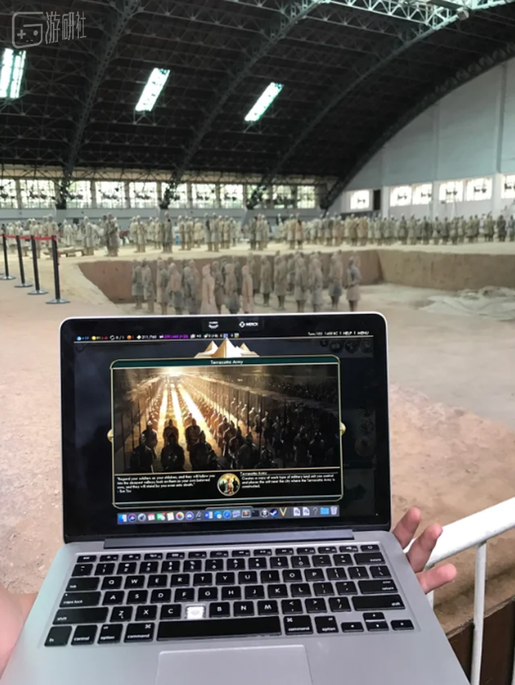 首先是兵马俑,这位老兄特地搬来了笔记本电脑来和现实中的奇观合影留念: