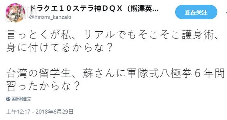 号称自己和来自台湾的留学生学过八极拳,在秋叶原徒手击退过三个混混,普通人拿着刀根本就打不赢他。