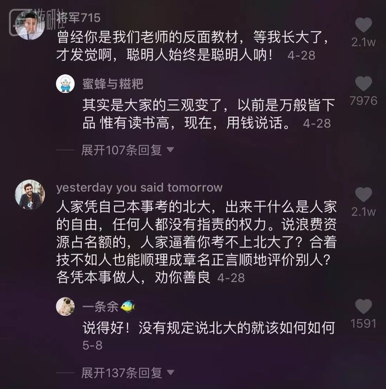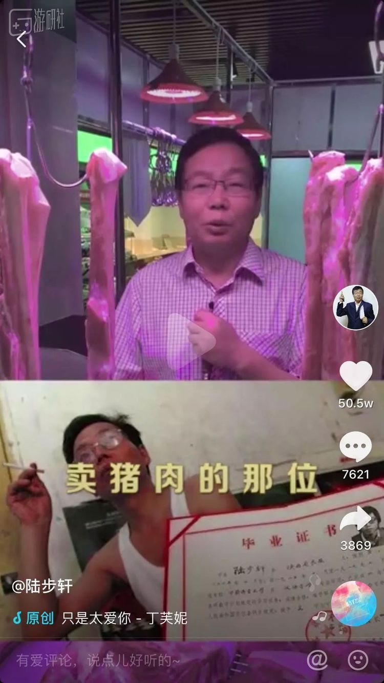 今年4月份他开通了抖音,陆步轩在视频中玩起梗,也普及了一些猪肉相关的趣味知识。他的第一条视频就获得了50万点赞,有不少人都回忆起这位曾经轰动全国的北大屠夫。视频下点赞最多的一条评论写着:“曾经你是我们老师的反面教材,等我长大了,才发觉啊,聪明人始终是聪明人呐!”