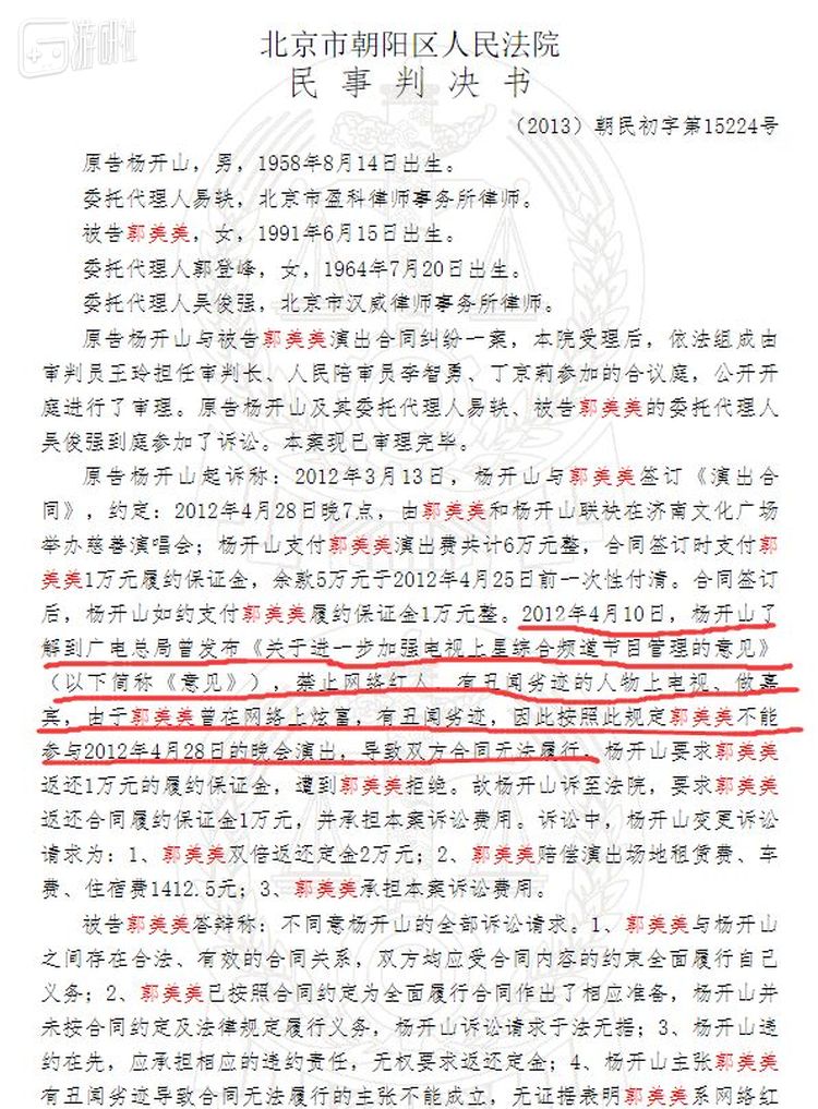 “郭美美”被封杀,其实早已有的苗头。2012年郭美美曾卷入一起民事纠纷,原因是演出方出钱请其参加演出,提前付了预付款。但是由于广电总局发布的《关于进一步加强电视上星综合频道节目管理的意见》中曾提到:禁止网络红人、有丑闻劣迹的人物上电视、做嘉宾。因此对方想要与郭美美终止合作,并收回预付款,遭到了郭美美的拒绝。对方将郭美美告上了法庭。