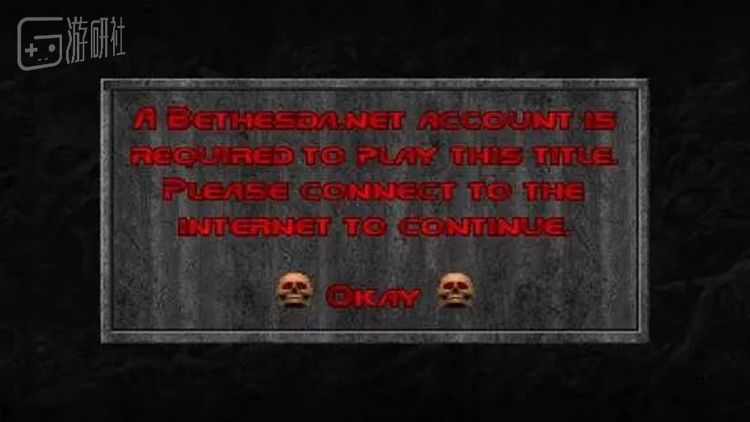 进入游戏的玩家们发现,系统会突然打断游戏,告知你 “本作需要登陆Bethesda.net的账号才能游玩”,通知下面并没有给玩家任何选择的余地,只有一个“OKAY”。也就是说如果不注册、登陆B社自己的账号,则无法继续游戏。