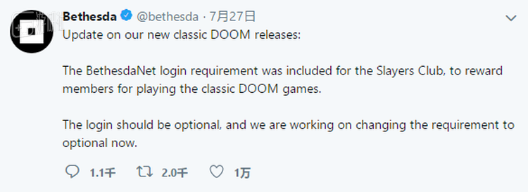 B社意识到了事态的严重性,很快发布了公告表示:“加入Bethesda账号的验证是为了联动Slayers Club——Doom官方粉丝社区,让游玩的玩家能得到社区奖励,这个登陆本应该设计成选择性的,我们已经在着手将它改成可选择性的功能了。”