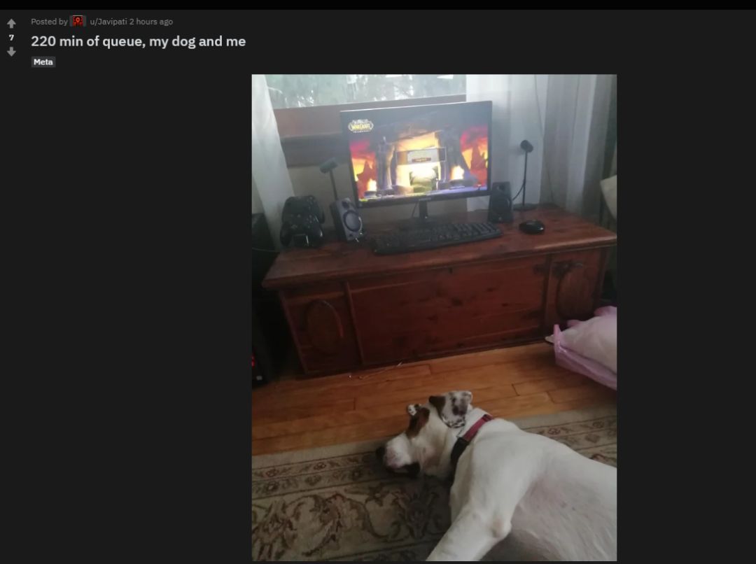 不过目前为止,踏上怀旧服征程的勇士们还是把大半时间都挥霍在了排队上。以至于让他们心力憔悴,连人带狗晕倒在了电脑前: