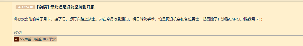 今天还有这样一个帖子:一位网友说自己早已充好了点卡,满心怀喜等着开服,却得知明日需要转院做手术。而他得到的大部分回应,都是“身体重要,”和“/cast 祝福术”。