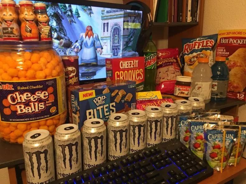 相较之下,国内魔兽玩家的粮草虽然气势没有这般磅礴,但讲究一个实用——红牛镇场,方便面是主力,还要适量掺杂瓜果蔬菜。