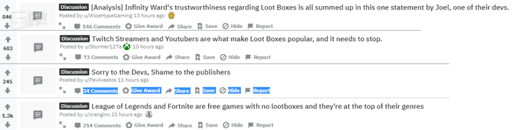 Reddit首页关于这事的讨论:“论IW的可信程度”,“Twitch和Youtube主播是开宝箱流行的推手”,“开发商对不起,发行商真丢人”,“英雄联盟和堡垒之夜没有影响平衡的宝箱也活得很好”