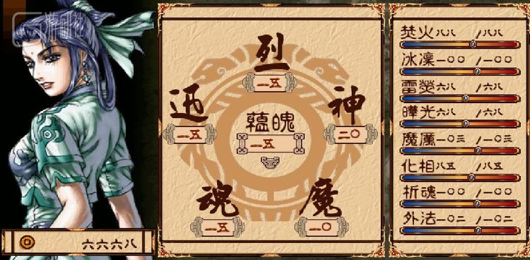 更要命的是人物养成部分,我见过大概玩了十多级,都没有发现原来这游戏是可以加点的朋友。有别于其他国产RPG游戏使用“攻击”、“防御”等概念,《幽城幻剑录》界面菜单用的是五内、及身、用器等词汇来表示人物属性,而是用烈、讯、魔、神、魂来代替,属性旁还有八大抗性,焚火、冰凛看字面意思倒还好理解就火抗冰抗嘛,可化相、外法就让人有点摸不着头脑了。