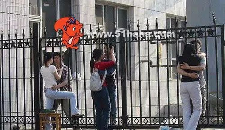 除了同校之间的爱情,封闭管理下,还有很多不在同一所学校的情侣。他们隔着冰冷的铁栅栏相拥,以此表达爱意和鼓励。