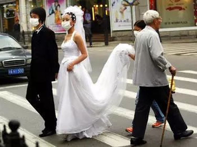 2003年5月7日,一张非典期间的爱情题材照片登上了报纸头版,画面中一对情侣穿着婚纱,戴着口罩,穿过马路去拍照。