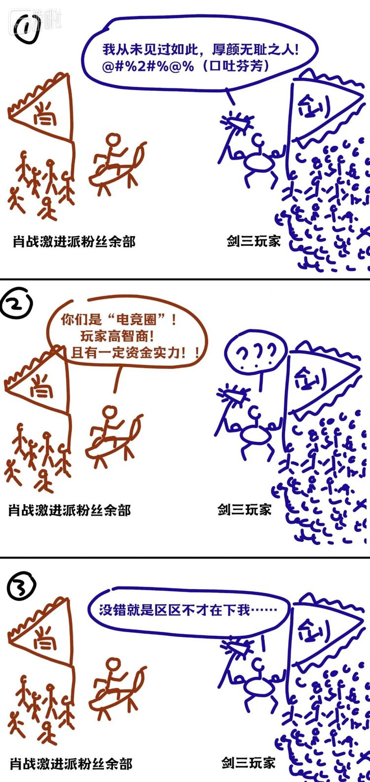 混战中,不知是自导自演,还是真情流露,更有喜剧意味一幕出现了——为了给没接触过游戏的肖战粉丝团科普剑三玩家的可怕, 有人为这群玩家用这样养的字眼描述: