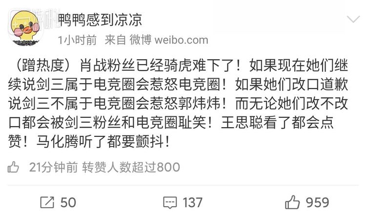 似乎是看到事情不妙,搞出事来的“肖战粉丝团——剑三战事分舵”的人也慌了,两害相权取其轻,于是赶紧发布新口号:“剑网三不是电竞圈”。