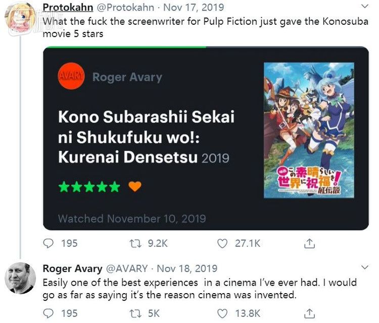 这是日式ACG作品十分擅长的。这类作品的典型代表,《为美好世界献上祝福》剧场版就引来奥斯卡奖获得者罗杰·艾弗里(代表作:《低俗小说》)的盛赞,说这部动画是 “最好的观影体验,甚至可以说是电影院存在的原因”,还在影评网站上打了五星。