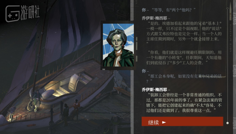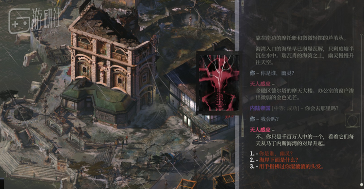 所以你有很多选择:比如和曷城警探去验尸,又或者先在城里逛逛。在城市的左上角,有一个站在帆船上的女人,她会在这里交代主要世界观:你所站立的地方是一个叫瑞瓦肖的国家,一片共产政权解体后的废墟,城市目前靠工会在维持运转,云云。