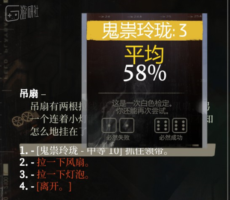 游戏里要通过的第一个检定,是把你发酒疯时甩到电风扇上的领带揪下来,考验的技能是[鬼祟玲珑]。像这样的技能一共有24种,技能基础数值取决于你“捏人”时的属性值。