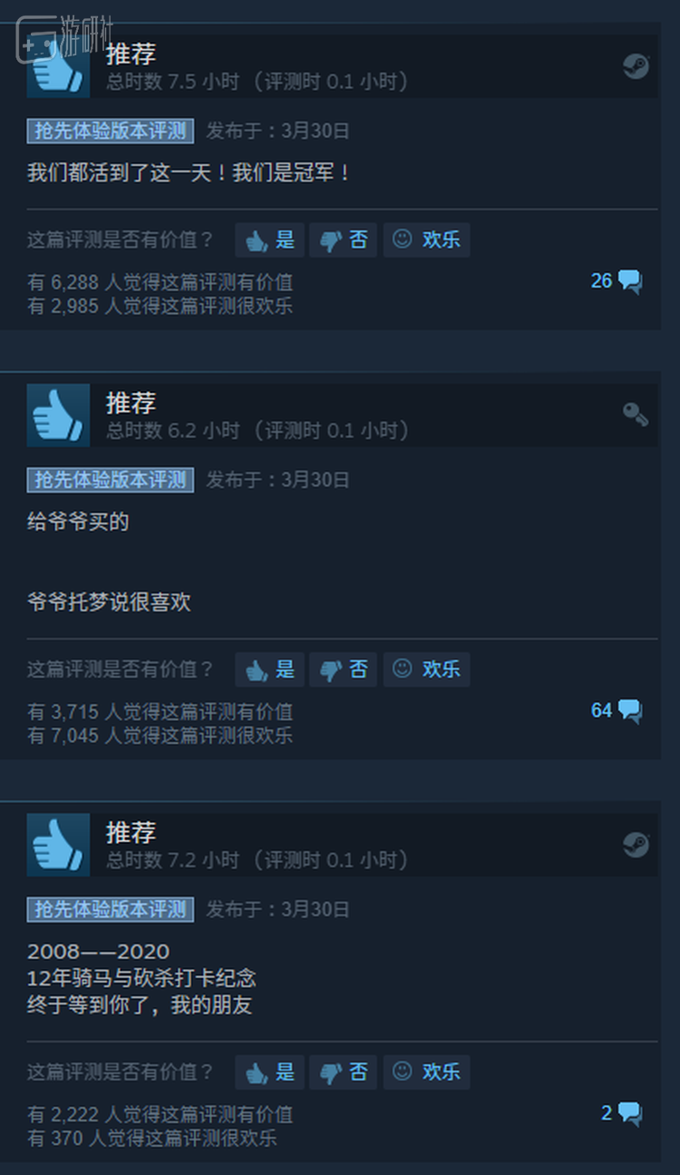 昨天,骑砍2的在线人数达到了17万,在Steam排行第三,仅次于CSGO与DOTA2,这是2020年Steam新作的最佳首发成绩。游戏发售后仅10分钟内,就有大量玩家在评论区缅怀靑春,或是庆祝自己的长寿。