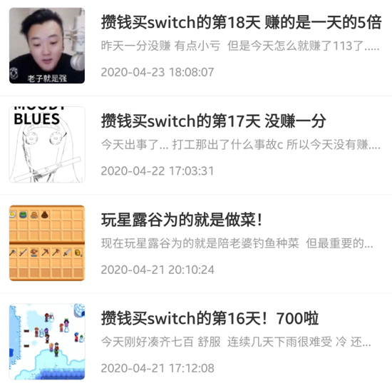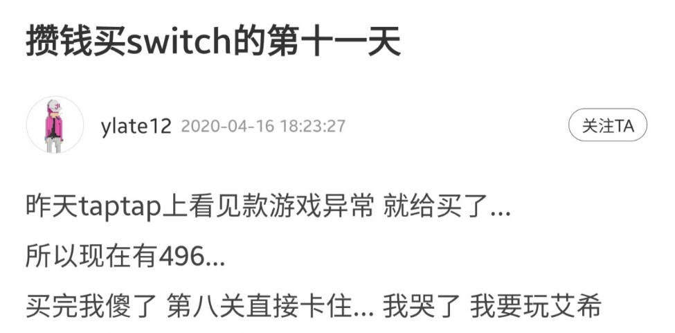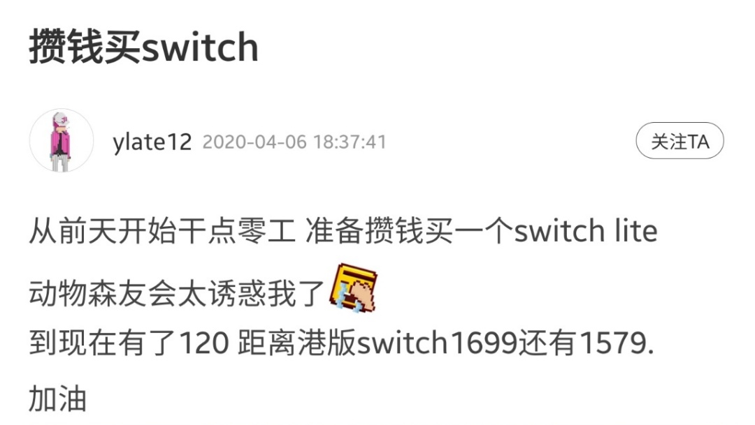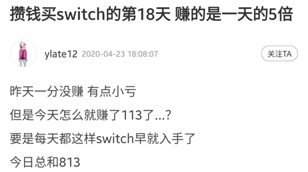 在游研社APP,有一位学生朋友攒钱买Switch已经第18天了,从他的发帖来看,应该是一位大学生。