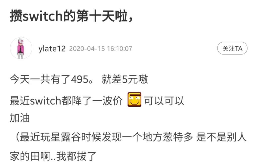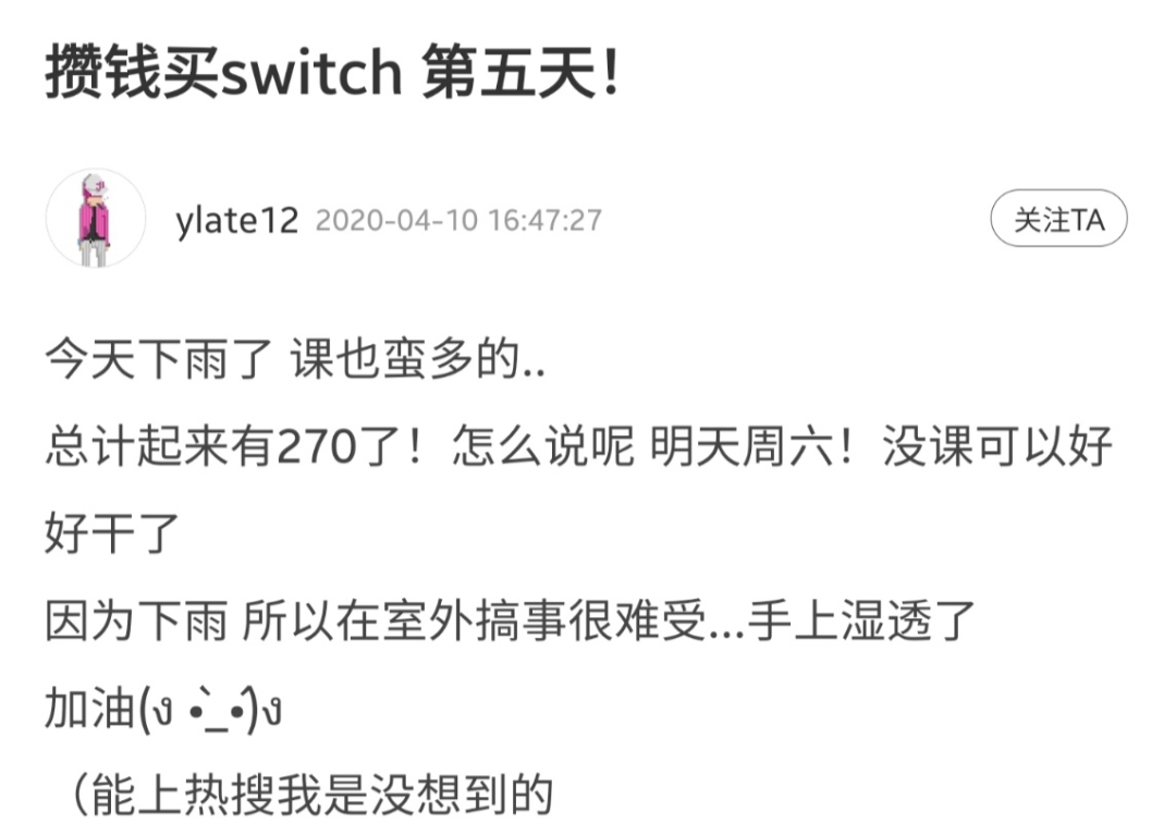 从第一天起,我就一直在关注这位同学。我希望他能攒钱成功,买到心仪的、便宜的Switch和游戏。