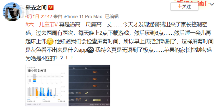 甚至不能说这是个特例,即使是资深移动互联网的从业者,也可能在手机知识上被孩子击败。昨天是儿童节,新浪微博的CEO发了一条微博,抱怨他的孩子猜出了iOS的家长控制密码,还知道把游戏卸载来规避系统的屏幕使用时间统计。