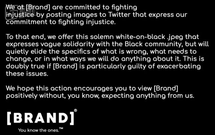 不过也有人认为大公司们的声明无非是利益驱使的政治正确,没尤其是有些公司旗下的很多账号都使用统一的模板来发表声明,显得没有灵魂。有人还制作了一个品牌通用的公关模板来嘲讽一些品牌没有实质性内容的声明。