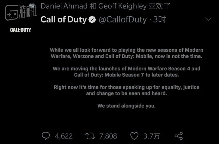 除了PS5的发布,有不少游戏相关的活动也都受到了抗议活动的影响,《使命召唤:现代战争》宣布第四季的内容更新将会延期,表示“现在是为平等发声的时候。”