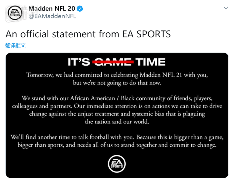 EA则延期了《麦登橄榄球21》的发布,表示消除歧视比游戏和体育更重要。