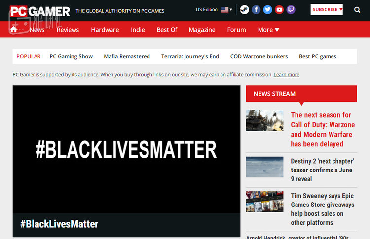 不少游戏媒体,也把头版改成了Black lives matter的标语。