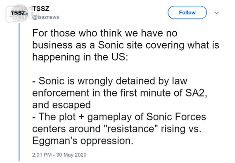 TSSZ官推表示,这次黑人平权运动的开端,和游戏《索尼克冒险2》开头几分钟颇为相似,都是“被执法部门误判入狱”。