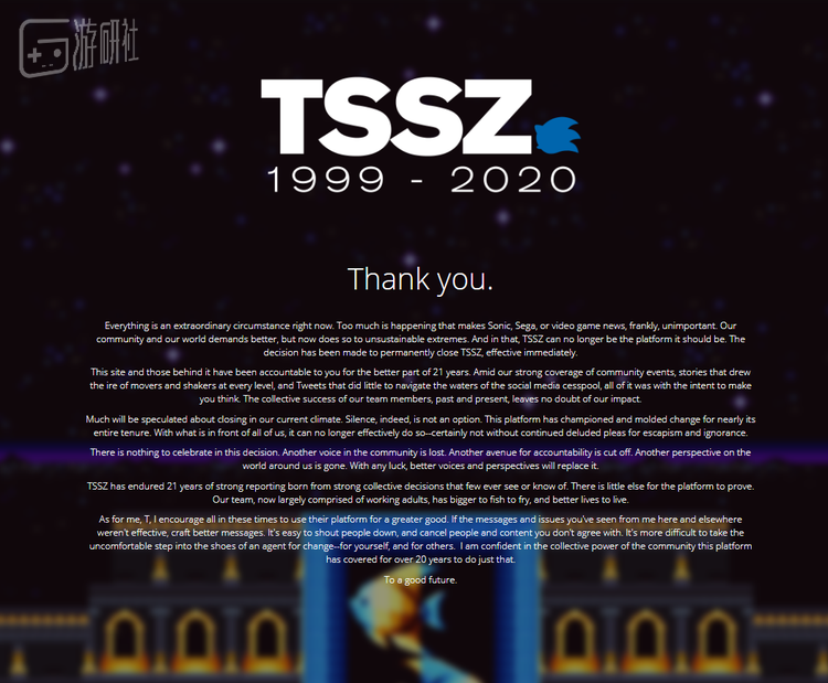 然而除去这些常规游戏厂商的支持外,平权运动似乎还导致了许多玩家意料之外的事件——比如拥有20年历史的海外游戏资讯网站TSSZ(The Super Sonic Zone)毫无征兆地关闭了。