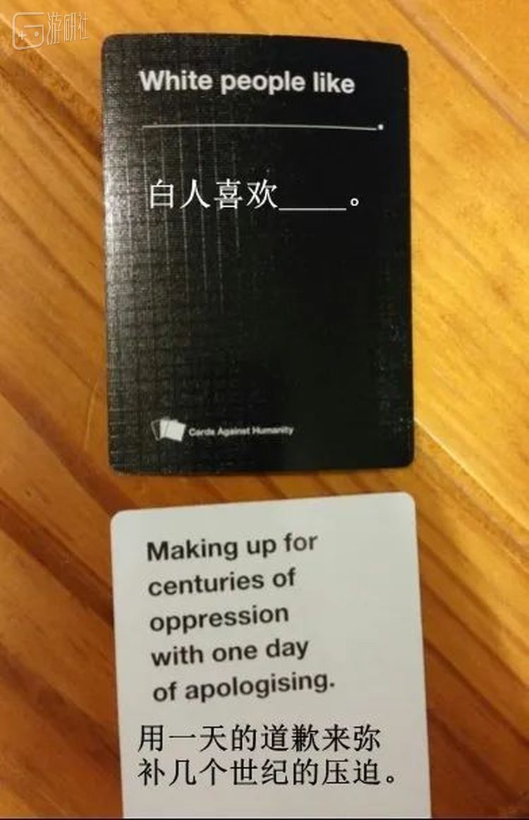 特别值得一提的是,反人类牌最原始的牌组中有将近四分之一的卡涉及到了种族主义。不少人甚至认为,这才是它大受欢迎的主要原因。