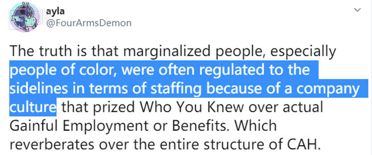 另一位曾为反人类牌设计卡牌的设计师则表示,因为公司文化,有色人种特别容易在团队中被无视,被边缘化。