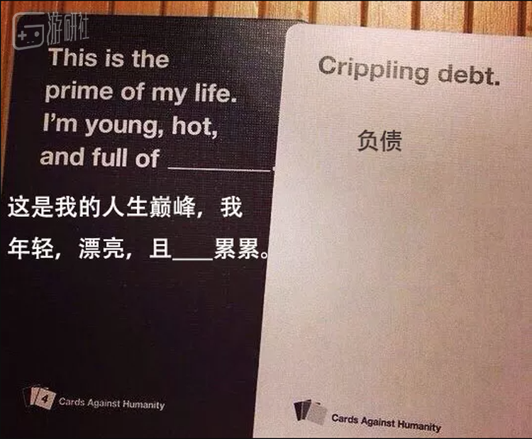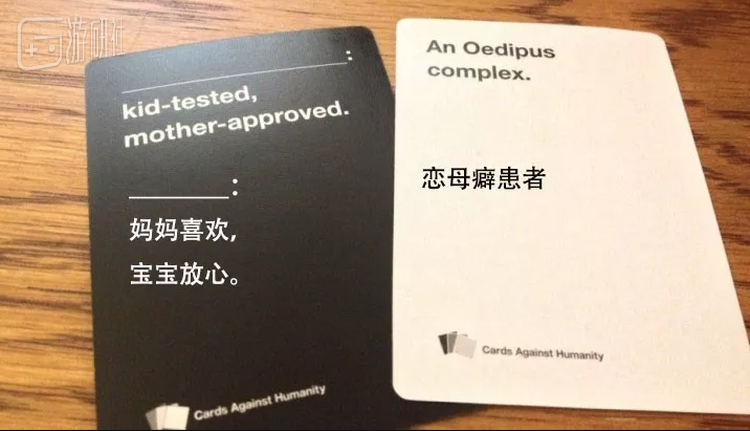 它实际是一款问答游戏,其牌分为黑白两种,黑牌为提问,白牌为回答。游戏开始时每位玩家抽10张白牌,轮流坐庄。庄家抽出一张黑牌,大声读出牌上的问题。其他玩家从自己的白牌中挑出一张作为回答,庄家来决定谁是胜者。