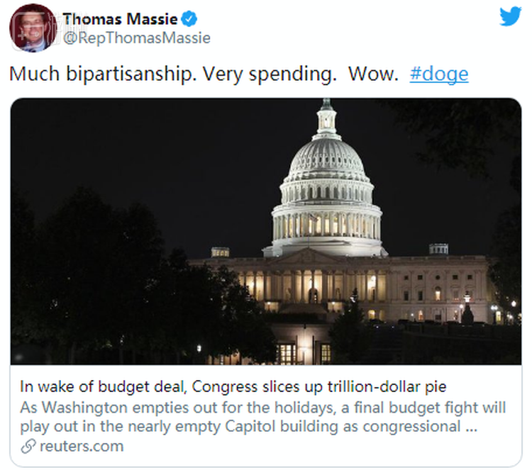 “Doge”过于出名,以致于它不再是属于亚文化的娱乐。2013年12月,在“Doge”仅仅火了几个月的时候,美国国会议员用自己的Twitter宣传预算分析报告,并在这条Twitter中使用了明显的Doge风格语句以及梗图以示幽默。