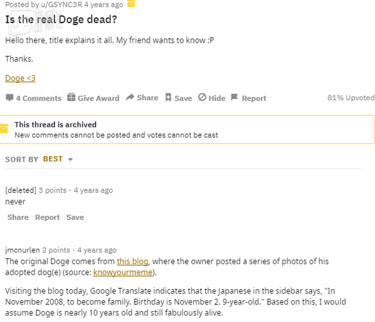 自从“Doge”走红以来,一些网友会时不时出来关注者Kabosu的情况,因此论坛常常出现这样的疑问:“Doge的原型是不是不在世了?”。