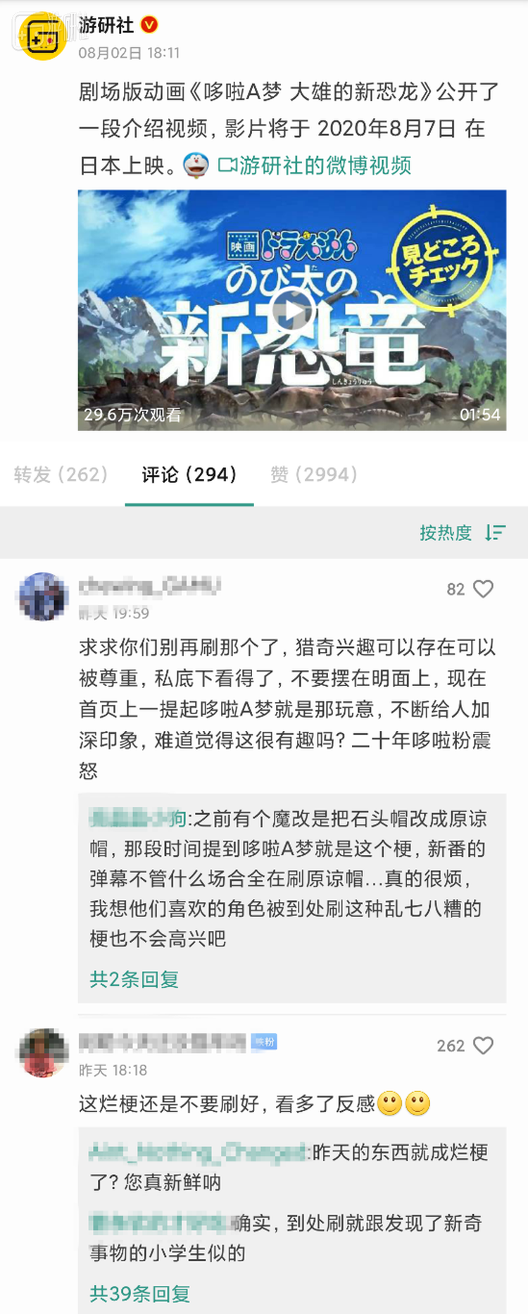 再加上《哆啦A梦》的新剧场《哆啦A梦 大雄的新恐龙》正好也是这个节点发布预告,只以我社的微博为例,评论下表示为“烂梗”所扰的人就有不少。