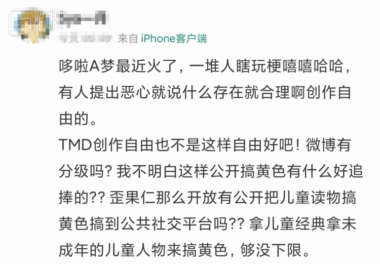 最主要的一个原因在于它确实看起来“恶俗”且“下流”。在《哆啦A梦》的外表下面,坐着确实演绎了一个少儿不宜的荤段子——在大多数人都以“毁童年”为调侃时,也有人觉得自己的童年是真的被毁了。