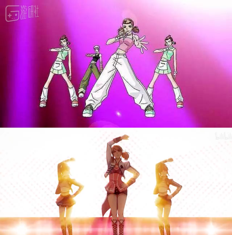 但制作组在另一些地方,又很下功夫。他们很用心地改动了动画里另一个主要组合:原本很有90后“哈韩族”气质的Happy女生,在新版的PV里,怎么看都更接近现在流行的女子偶像团体。在老版里主打叛逆女孩设定的麦云洁Maggie,也变得更像组合里走元气少女路线的小偶像,站在C位向粉丝们精神抖擞地挥动手臂。
