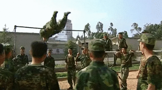 请各位读者在现实中不要模仿这个动作,主要是考虑到我们平日里所见到的单杠质量远不及部队,一旦单杠承受不住压力,怕是要杠毁人亡。