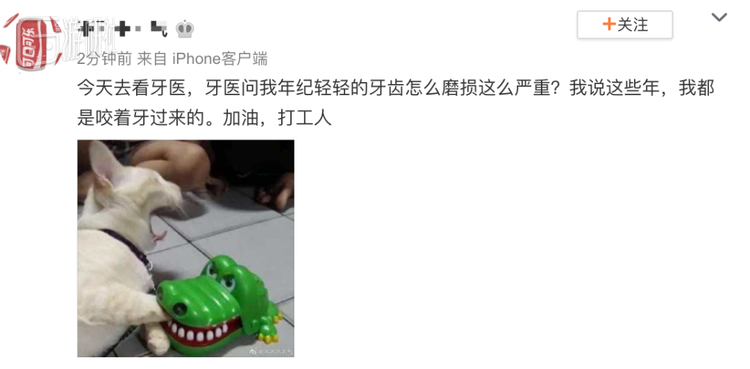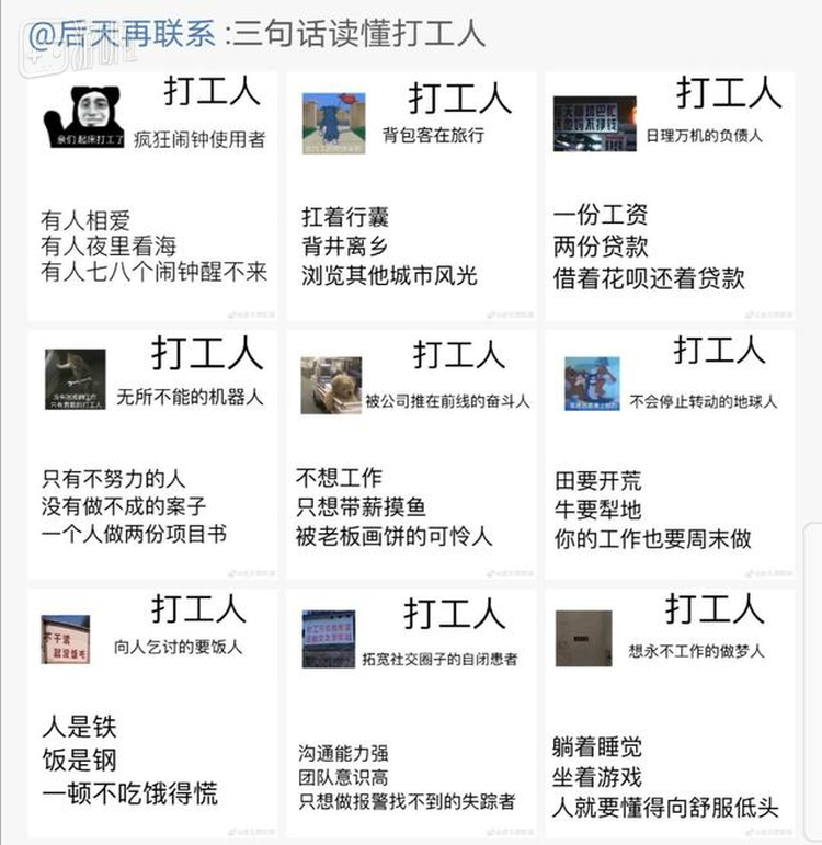 类似于此的,自我矮化式的身份解读还有不少,也都在说明同一个迹象:大部分人,都开始明白自己就是个打工的“打工人”。
