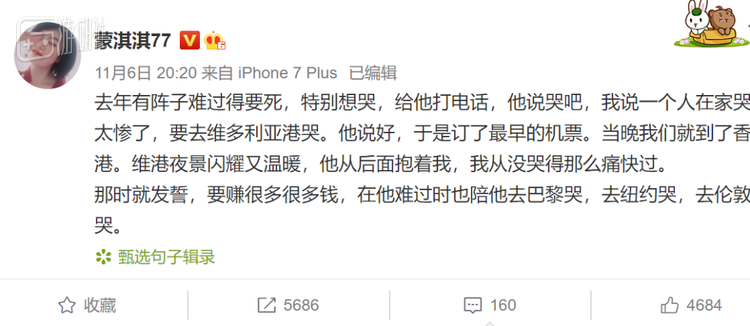 “蒙淇淇77”通常一天里会发很多条描述和她爱人之间亲密互动的微博,偶尔也会有几条兴趣使然的心灵鸡汤,读下来每每让人羡慕嫉妒恨,感慨这种网文女主才有的待遇恐怕只存在别人的世界里。唯一让人颇为扫兴的是,“蒙淇淇77”发表的照片并不多,大多以文字描述为主,不够让人一饱眼福。