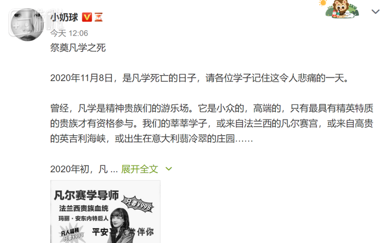 在这段对“凡学”的悼文中,小奶球用戏谑的哀伤口吻声称,“凡学是小众的、高端的,只有最具有精英特质的贵族才有资格参与的”,是自己“身为法国皇室玛丽安东尼的唯一纯血后人继承下来”的宝贵遗产。