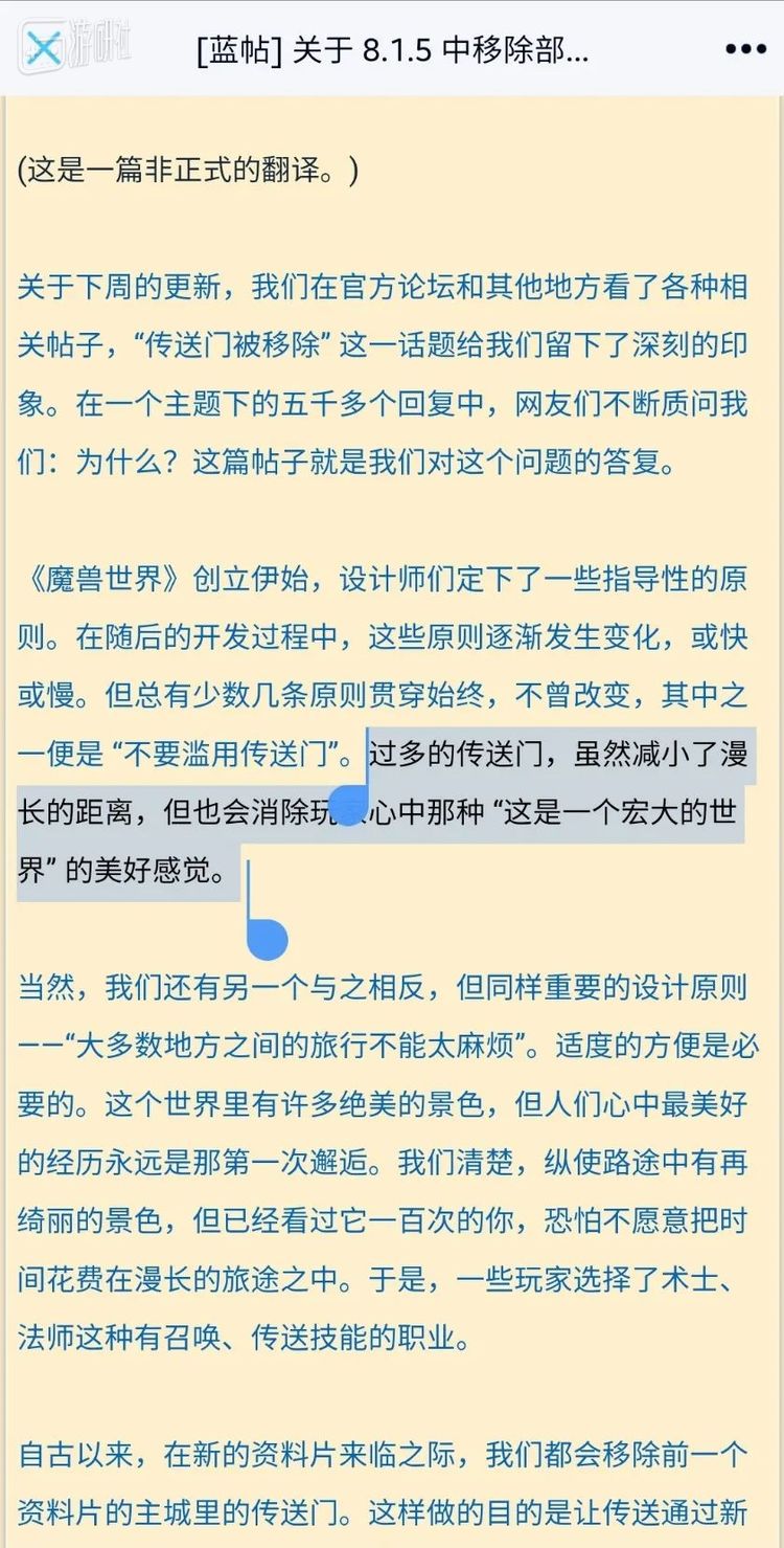 在这个小插曲的最后,我还研究了下,暴雪对删除传送门有过一些解释。他们说,“过多的传送门,虽然减小了漫长的距离,但也会消除玩家心中那种‘这是一个宏大的世界’的美好感觉。”