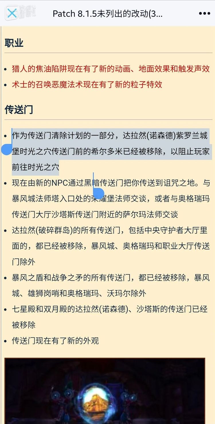 后来我查了一下,这倒不是旅法师记错了,而是事出有因。在《魔兽世界》的8.15版本,“作为传送门清除计划的一部分,达拉然时光之穴传送门已经被移除,以阻止玩家前往时光之穴”。