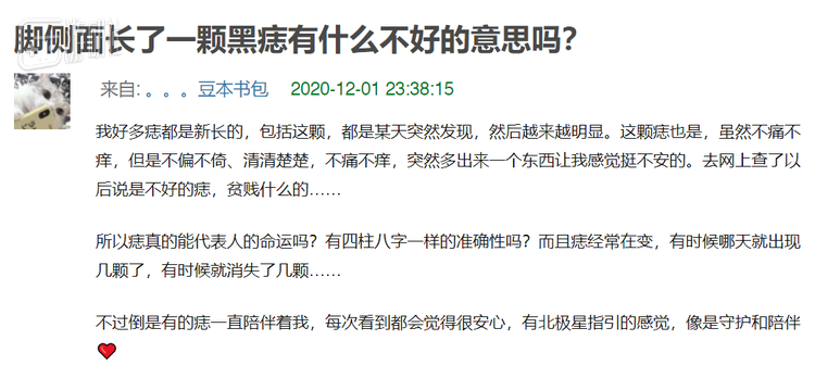 类似的讨论还包括:脚侧面新长了一颗黑痣,是不是真的代表之后的命运就要走向贫贱了。