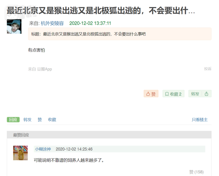 比如,最近北京新闻里又是发现猴子又是发现北极狐,立刻就有人担心这是什么动物集体出逃的异象天兆,马上发到了灵异组。而灵异组的小伙伴也给出了相当中肯的解答是:“可能说明不靠谱的饲养人越来越多了。”