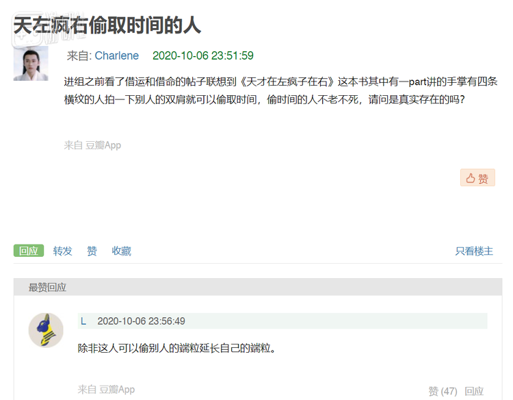 有人讨论畅销书里写的偷寿命的人,询问手掌有四条横纹的人是不是真的可以不老不死。灵异组组员的回复就更科学理性了:“除非这人可以偷别人的端粒子延长自己的端粒。”