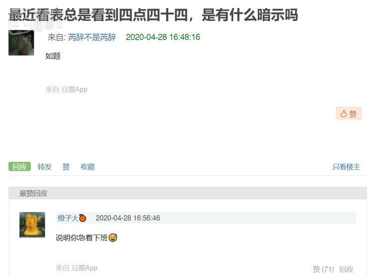 除开这些多少和健康医疗相关的讨论,在一些更切中灵异的讨论里,灵异组组员们也展现出科学求索的精神。打个比方,有人发现自己最近看表老是踩在四点四十四这个点上,觉得已经超过了纯然巧合的地步,可能背后是有灵异暗示。组员阅完之后,也给出了很给力的解答:“说明你急着下班。”
