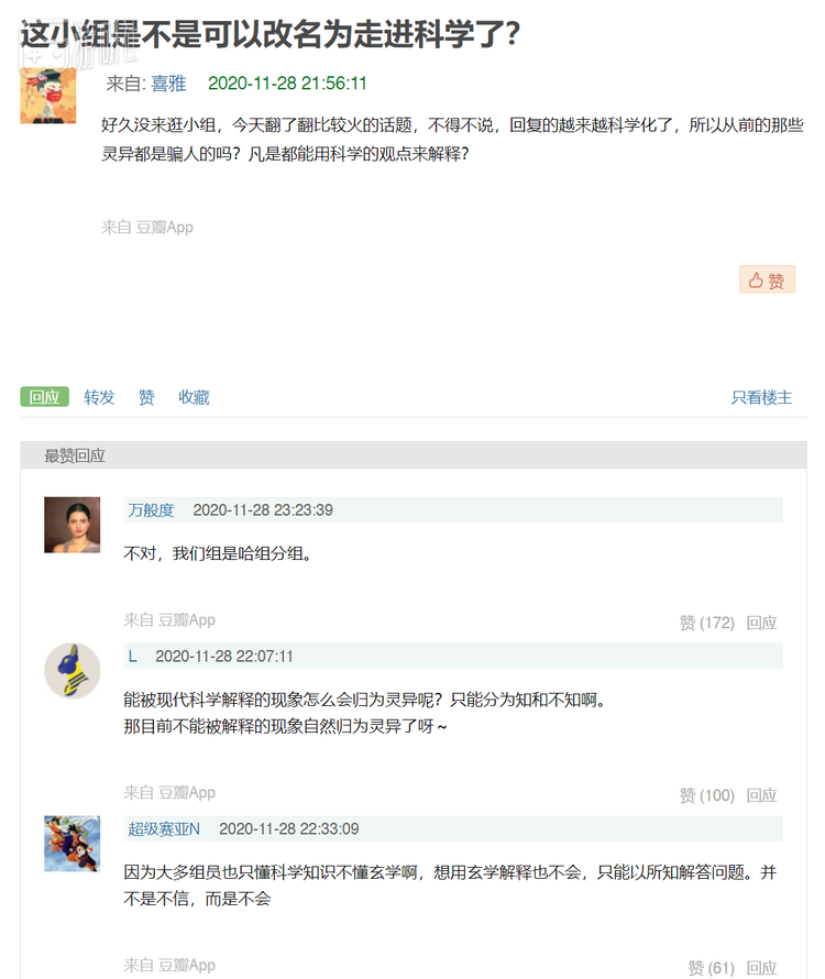 或许有人要说,置顶帖是为了维持豆瓣小组内讨论秩序而设置的,讲的并不是灵异内容本身,和灵异组气质不符很正常。毕竟,灵异组是什么样,还得看灵异贴——随意点开组内一篇讨论帖,就会发现这种“科学”气场真是无处不在。