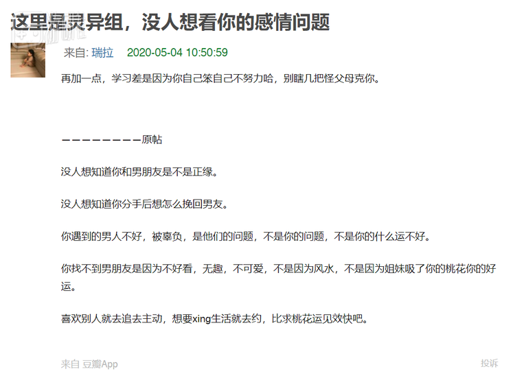 只见入目就是一句“学习差是因为你自己笨自己不努力哈,别瞎几把怪父母克你”,接下来再是一句“你找不到男朋友是因为不好看,无趣,不可爱,不是因为风水,不是因为姐妹吸了你的桃花你的好运”。可以说,字里行间都写满了科学合理、人间真实。