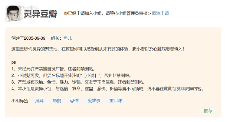 点进灵异组,首先映入眼帘的就是上面这一串告示:“这里是恐怖灵异的聚集地,在这里你可以感受到从未有过的体验,胆小者以及心脏病患者慎入!”一个加强语气的叹号,配合底下写着“灵异”“恐怖”“重口味”的小组标签,有几分震慑人心的味道。