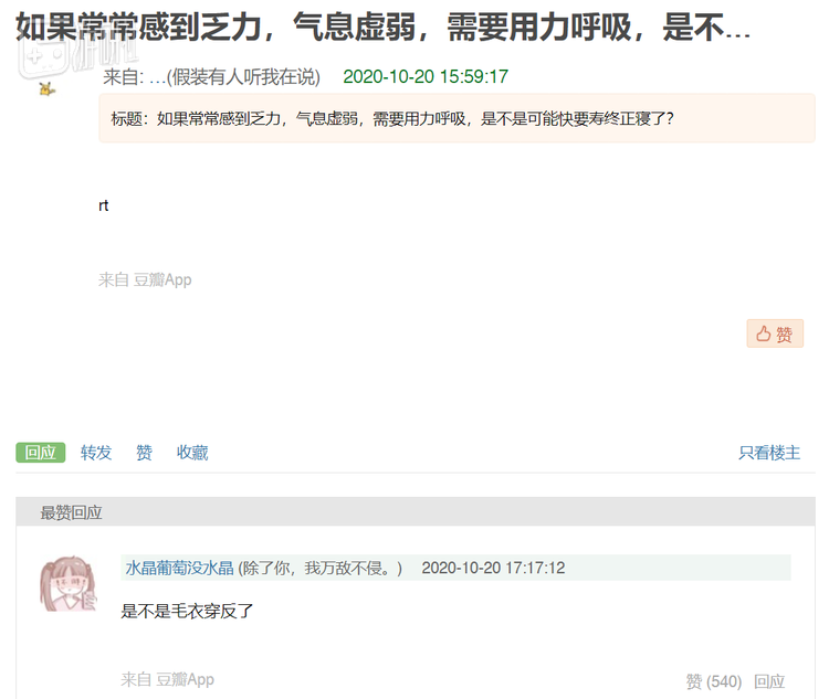 再比如,有人常常无故感到乏力气虚,忍不住担心是不是自己大限将至,于是发到灵异组求解。灵异组组员答曰:“是不是毛衣穿反了?”
